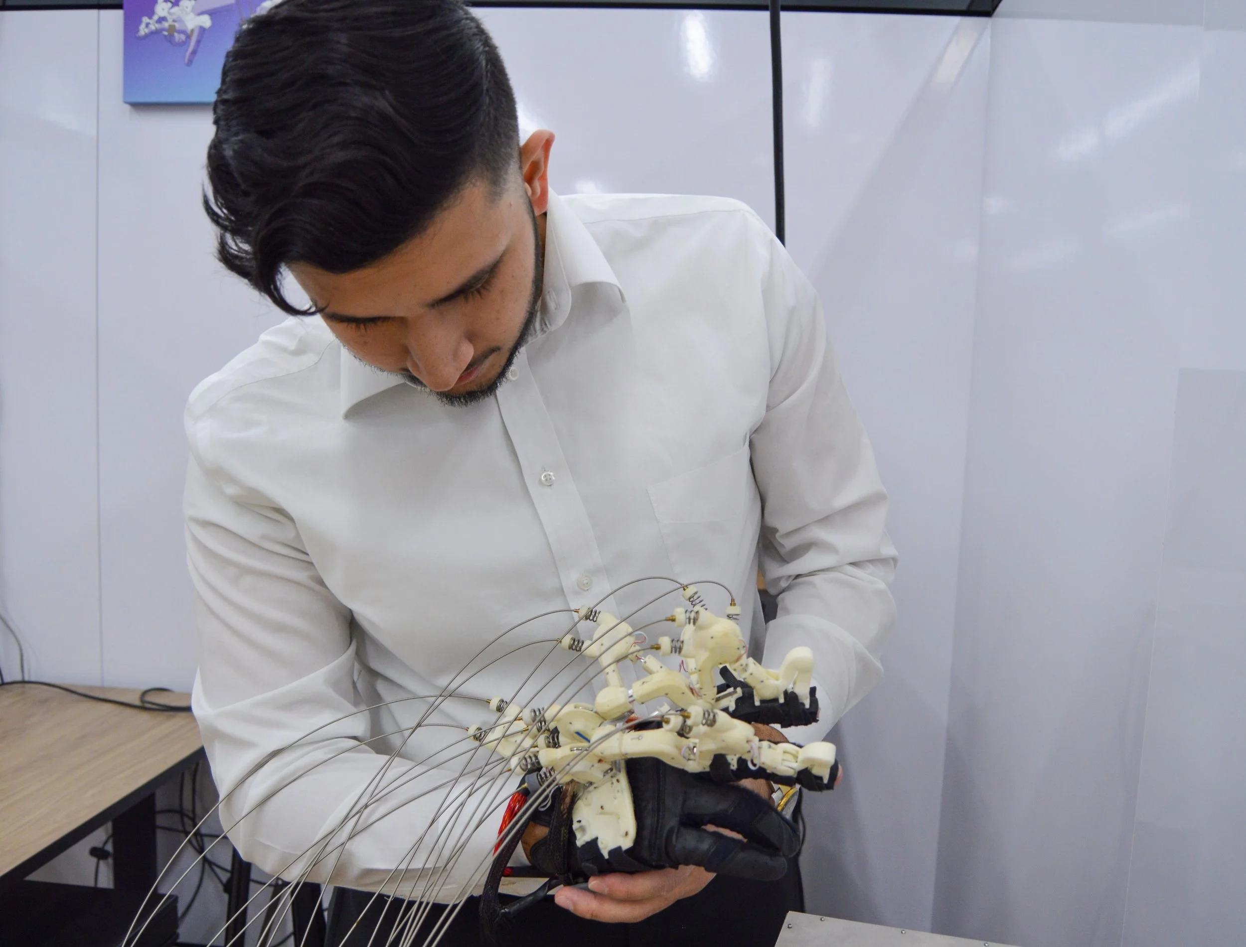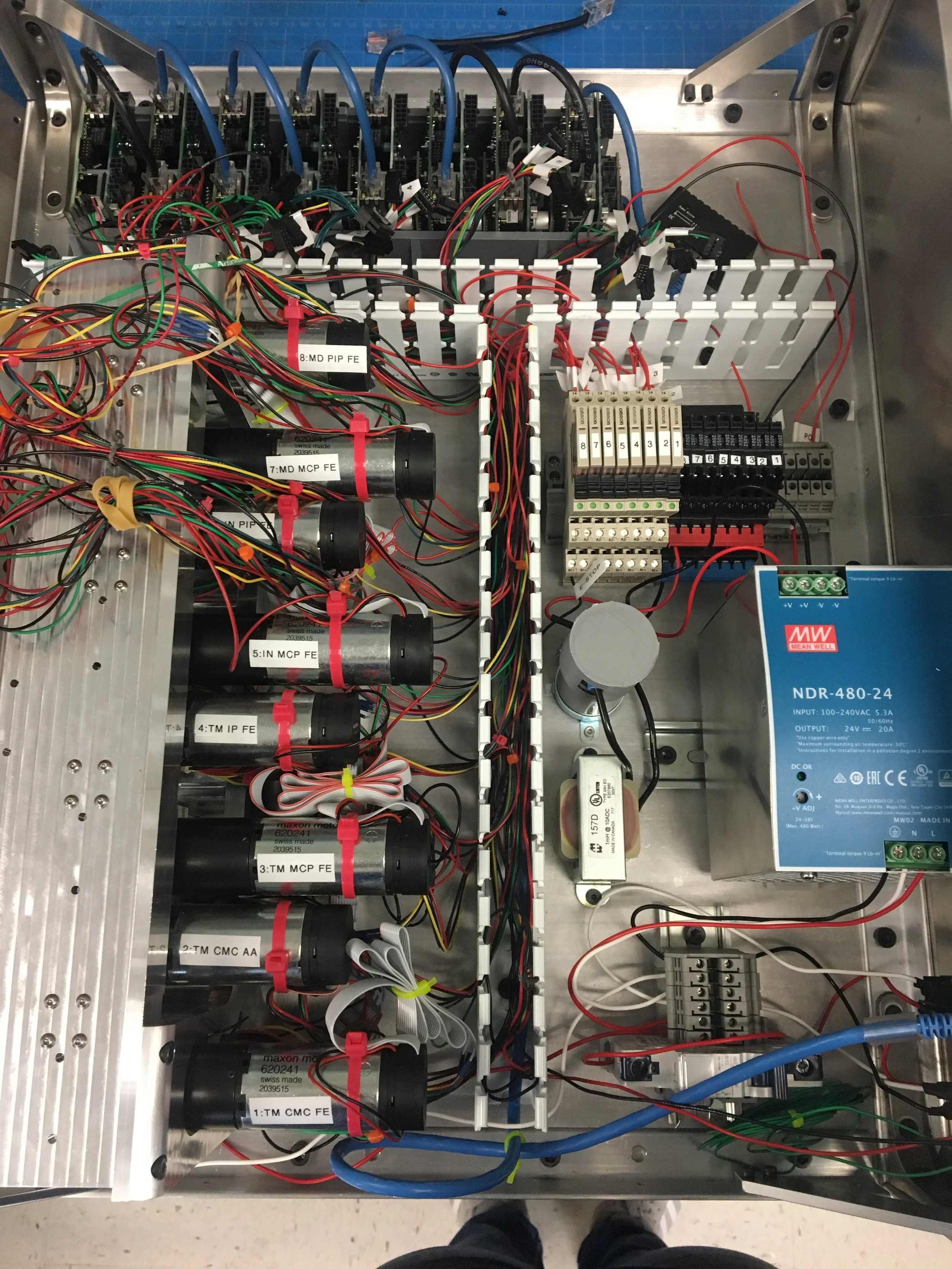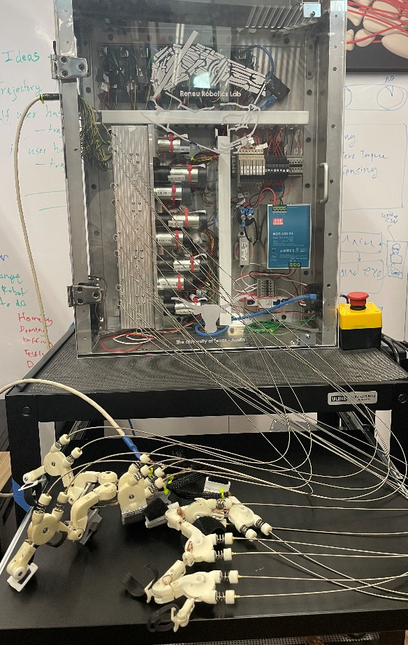 The Maestro hand exoskeleton is an 8-DOF wearable robotic device designed for rehabilitation and teleoperation applications. The system uses Bowden cable series elastic actuators (SEAs) to provide precise finger motion control and haptic feedback while maintaining a lightweight, backdrivable design. It is controlled through EtherCAT motor drivers and a custom Maestro C++ library.