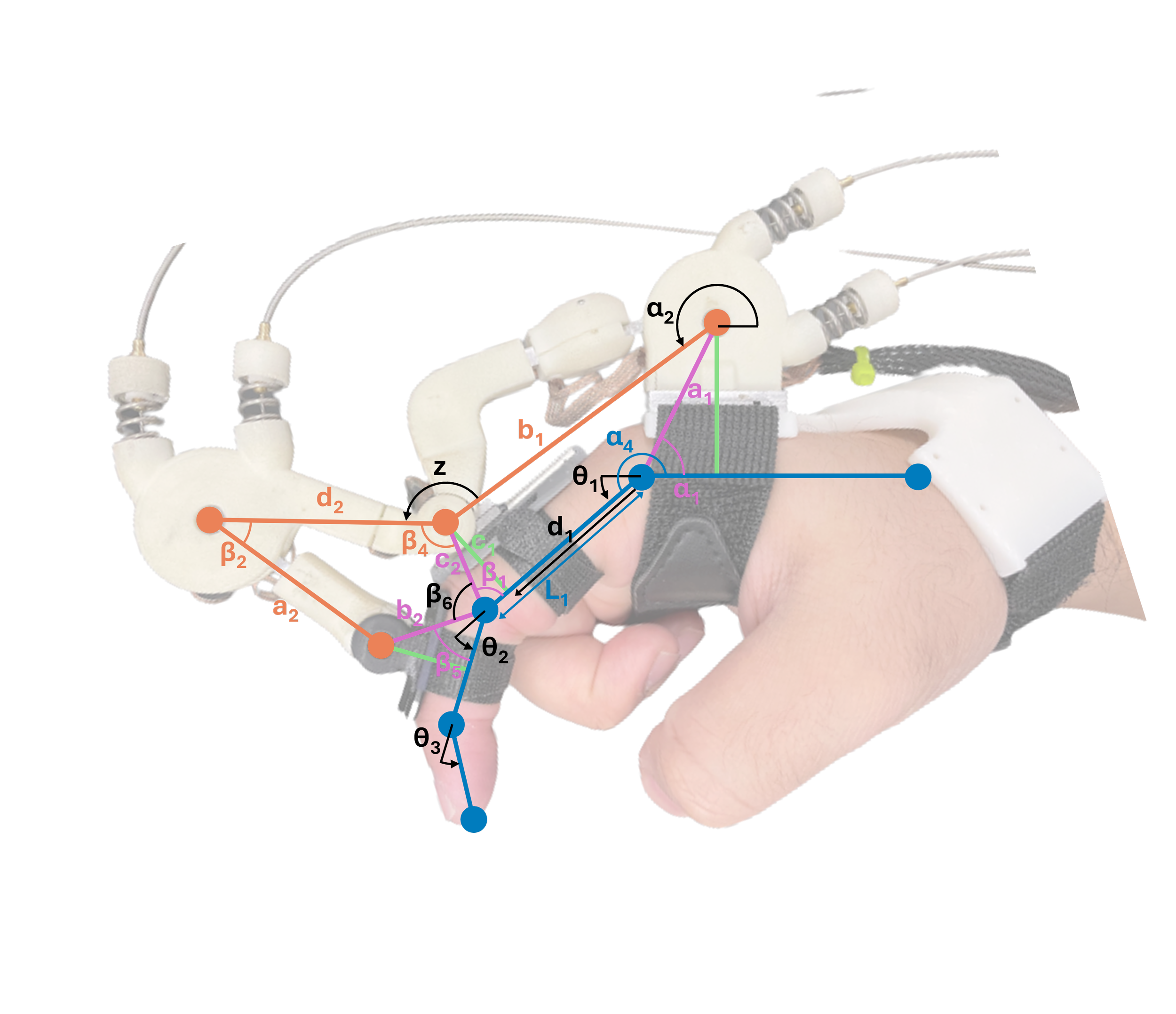 Developed comprehensive kinematic models using four-bar linkage mechanics and Denavit-Hartenberg parameters for multi-DOF finger exoskeleton systems