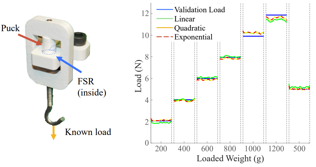 Calibration setup and results from a representative FSR (1s of data under each loading condition). The linear relationship has the best performance across calibration tests across 24 sensors.
