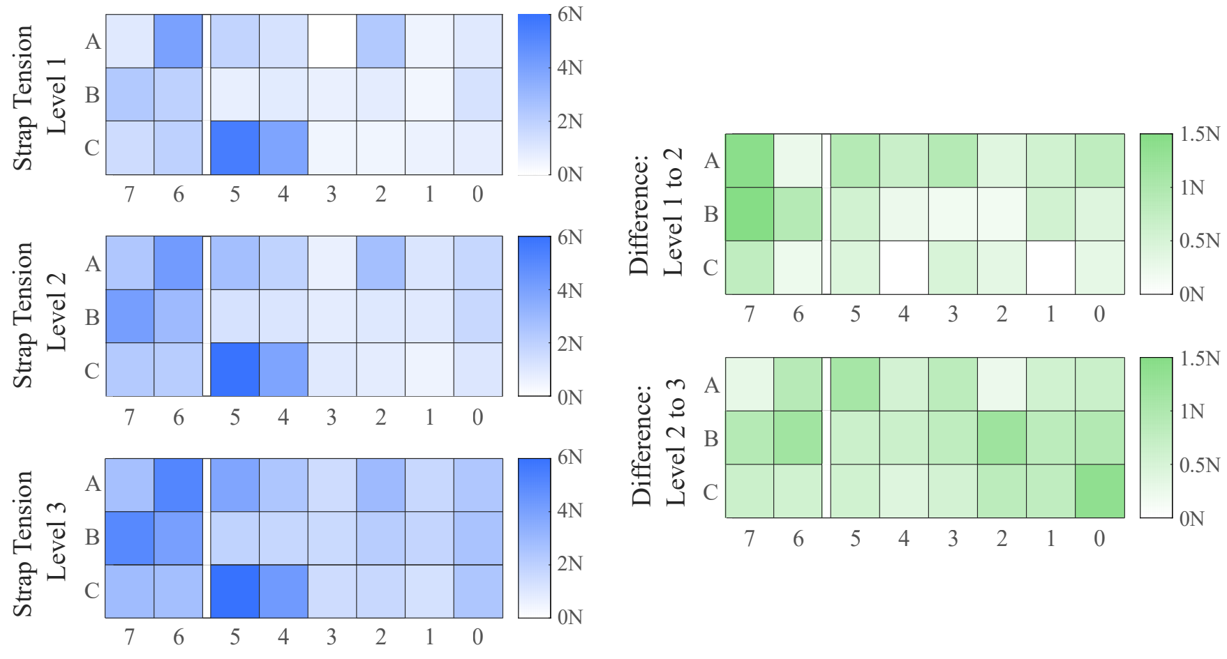Heatmaps show distributed interface forces in Newtons across rows (vertical axis) and columns (horizontal axis). (Left) Distributed interface forces measured from FSR data at three strap tension levels where the third level is the tightest. (Right) Difference in distributed forces from the first level to the second level and from the second level to the third level.