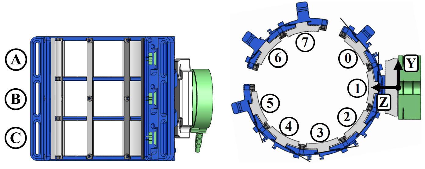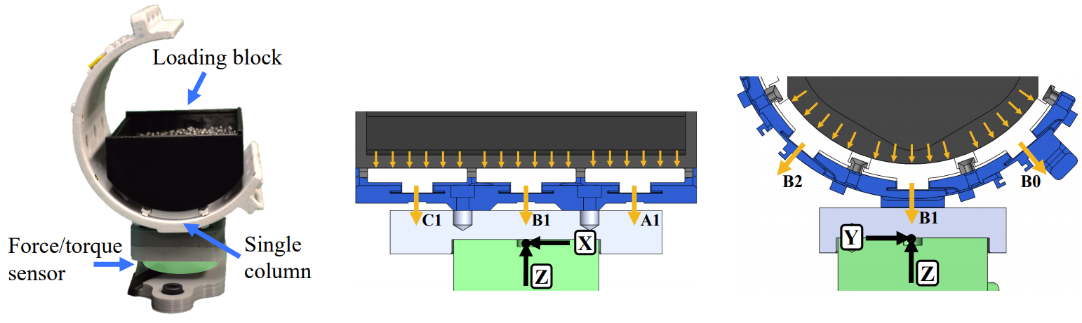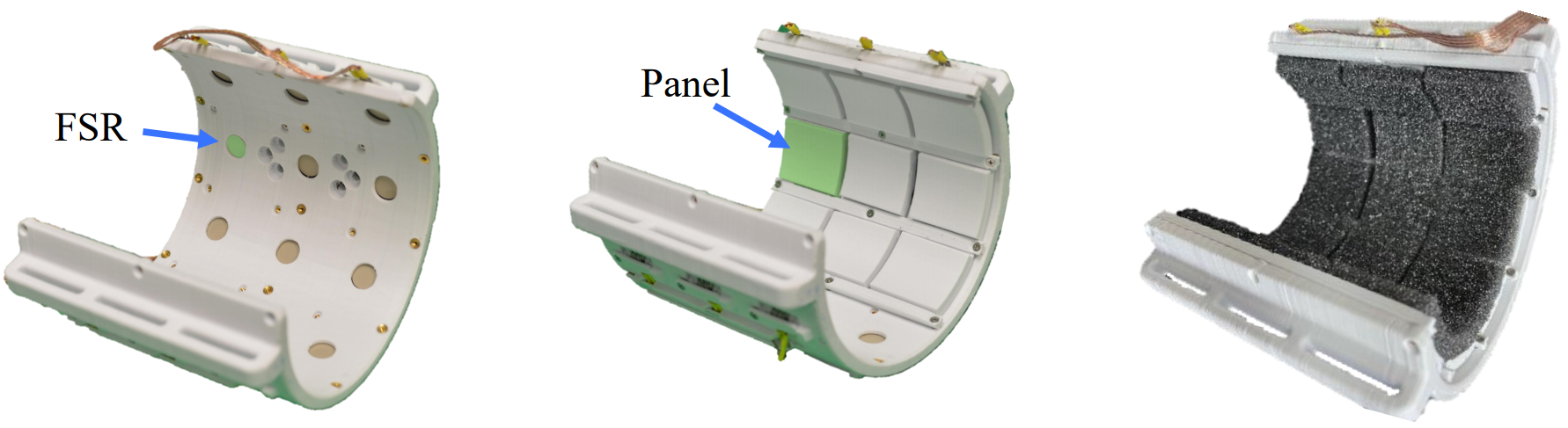 Sensor placement on the cuff is distributed across three rows and eight columns. Foam padding is not shown in these images. The orientation of the six-axis load cell can be seen.