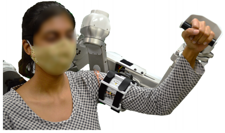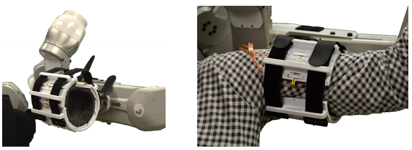 The sensorized upper-arm cuff is used with the upper-body Harmony exoskeleton and a human user to explore potential applications of this work.