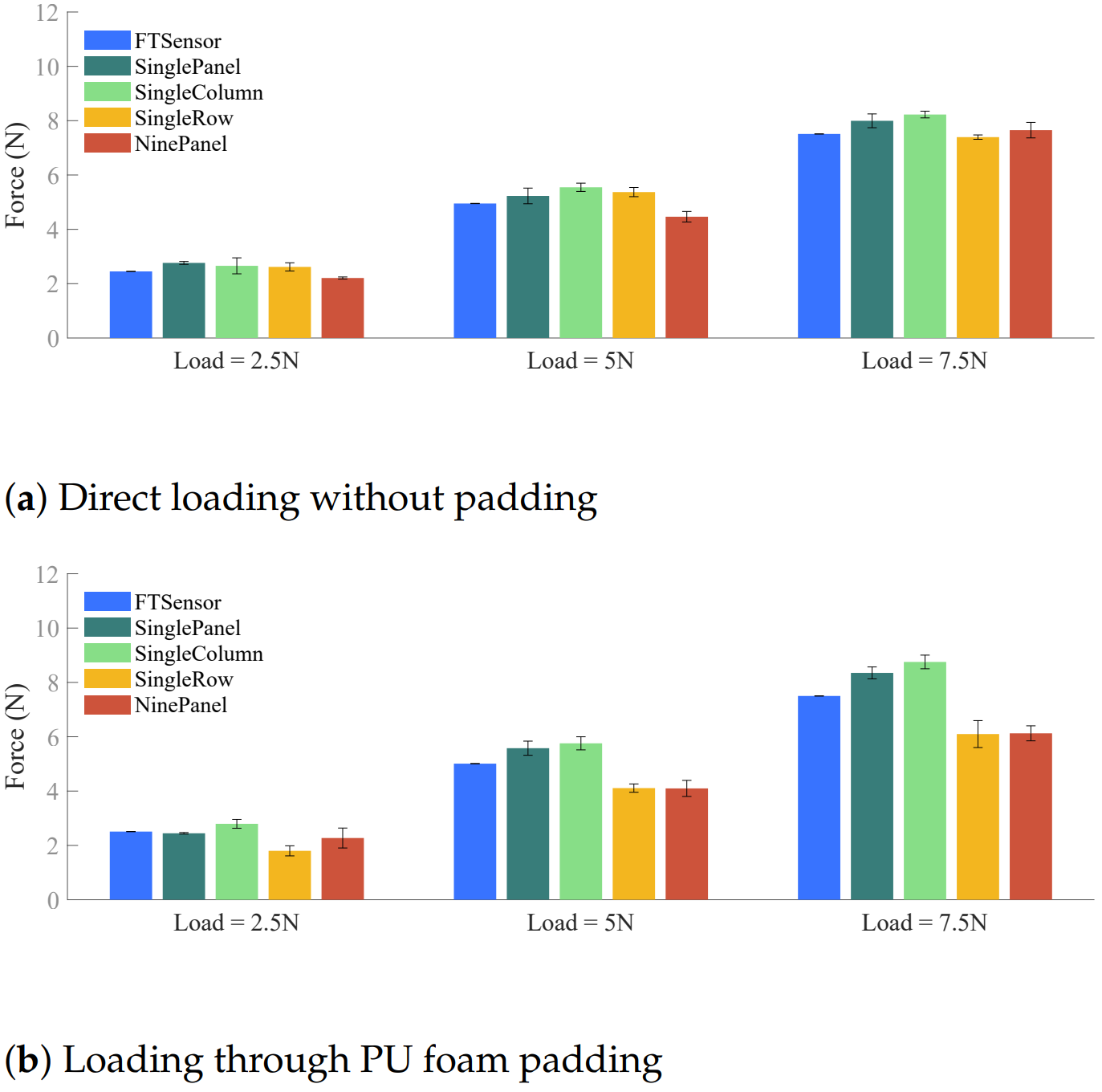 Results comparing the vertical loads measured by the force/torque sensor against the total sum of loads measured by the FSRs (in the vertical direction) for four loading cases: Single Panel, Single Column, Single Row, and Nine Panel, at three load levels. The error bars represent standard error across three repetitions. The error bars represent standard error.