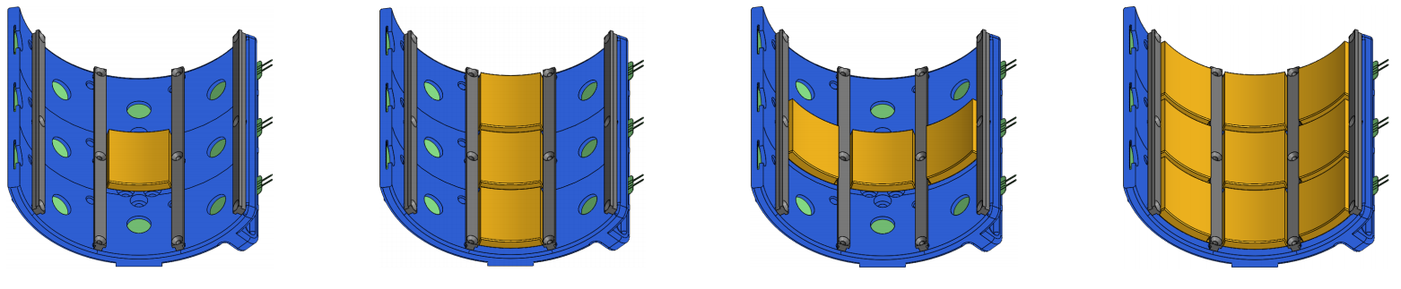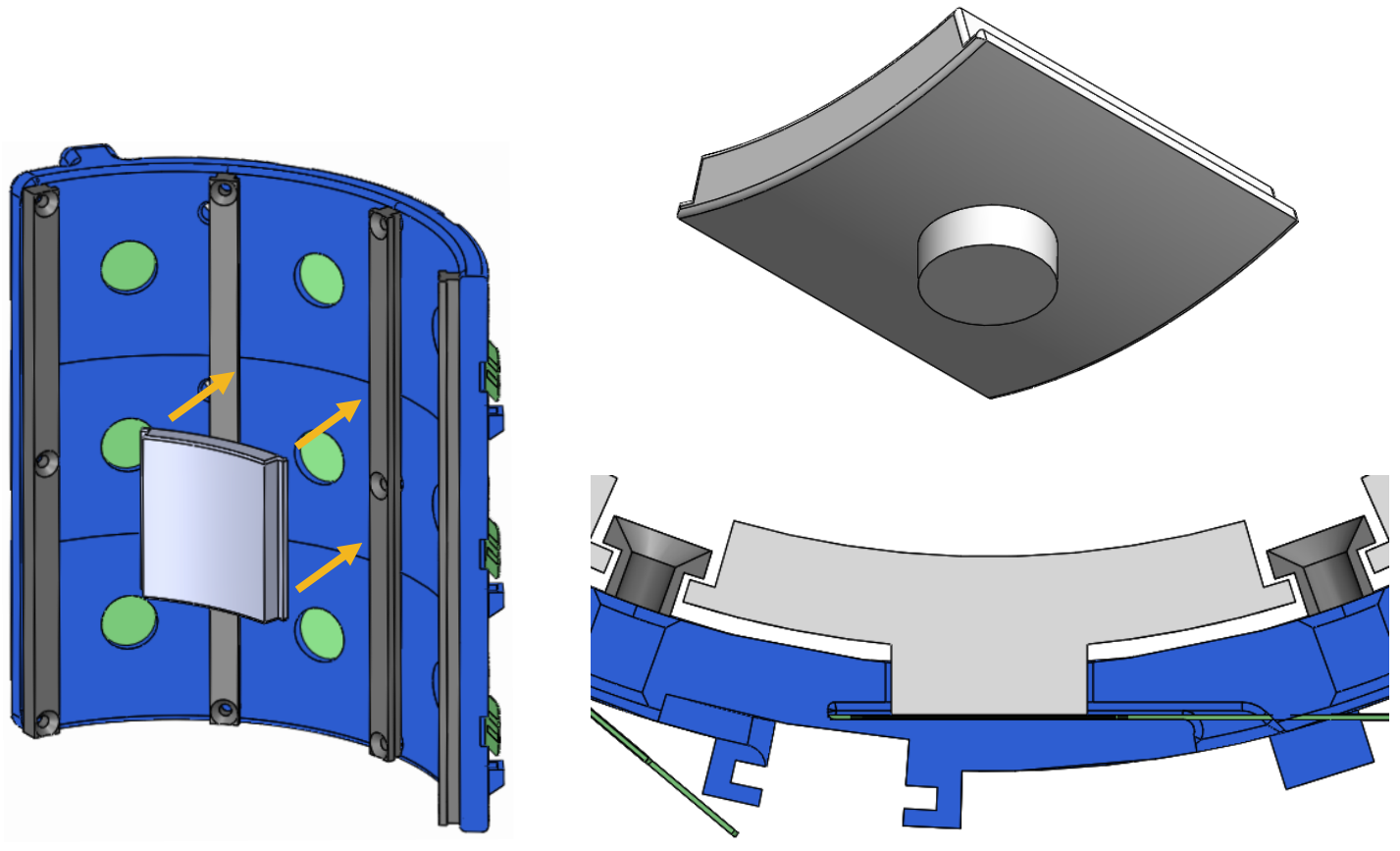 Integration of a single panel (white) installed in the sensorized cuff (blue) shows how it interfaces with the FSR (green) through a puck design. The divider rails (gray) keep the panels from falling out.