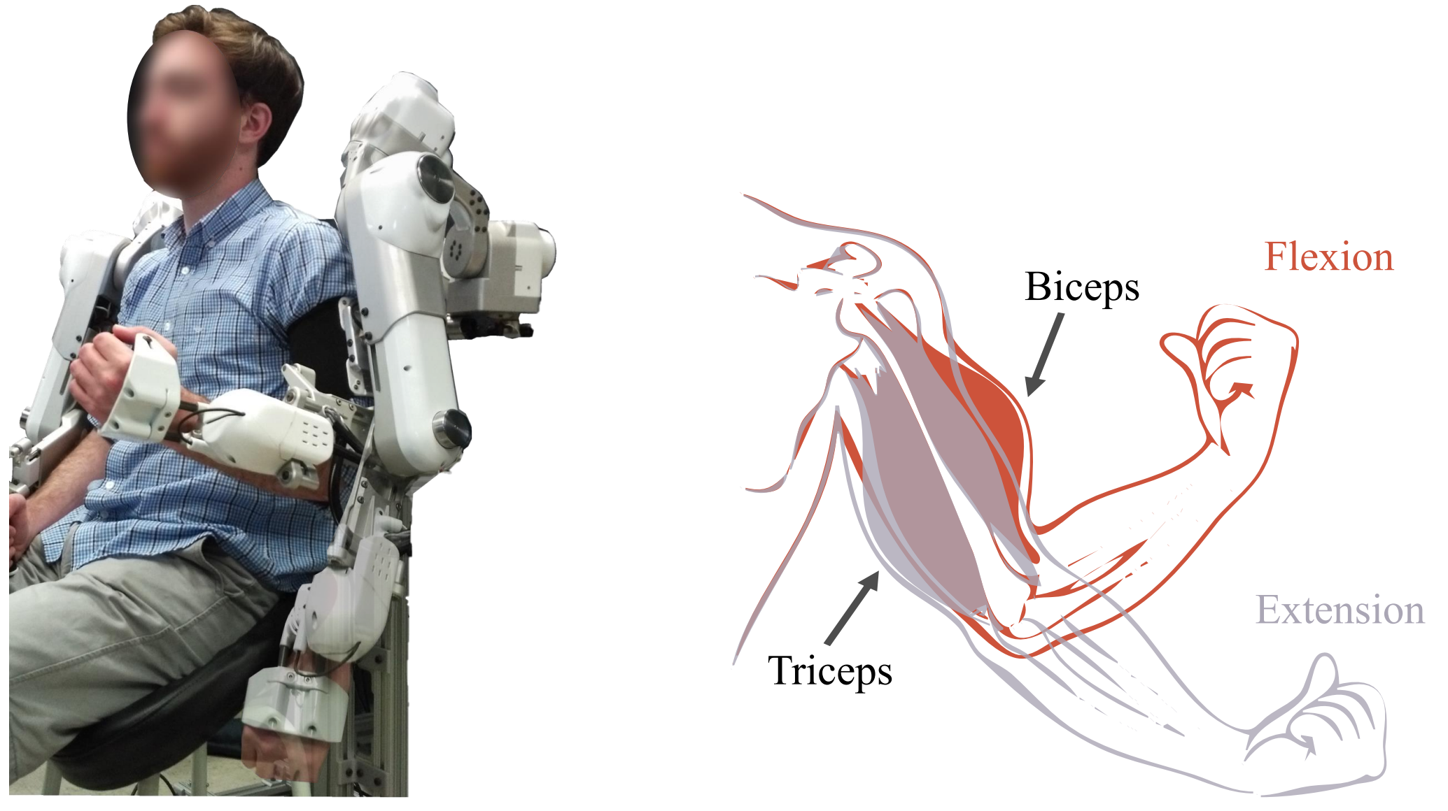 (Left) Movement performed by the subject starts at full elbow extension (transparent), going to full flexion of the elbow (opaque) and back to full extension at the end of a single repetition. (Right) Expected deformation of the arm’s muscles in response to the performed movements.