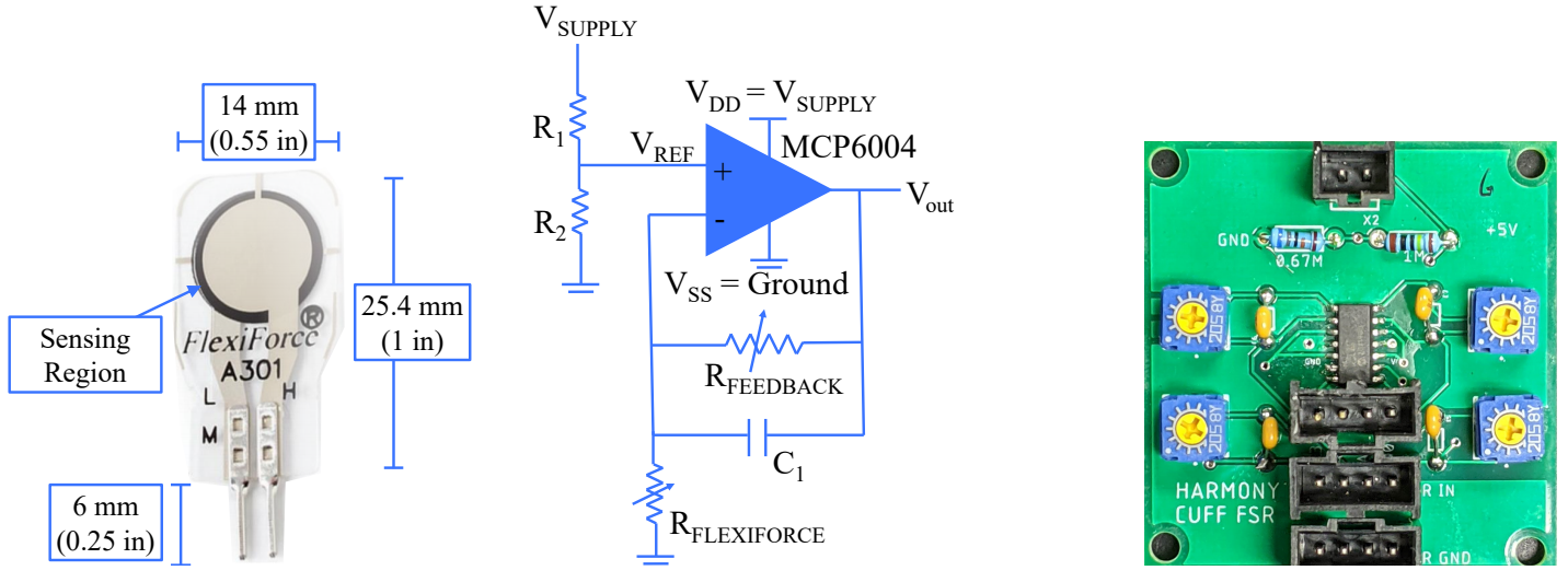 The force-sensing resistors (FSRs) are made from piezoresistive material that correlates the force applied on the sensing surface to the resistance of the sensor in an electrical circuit. This circuit requires the use of an operational amplifier. A printed circuit board (PCB) has been designed for the implementation of the circuit, such that each PCB accommodates four FSRs.