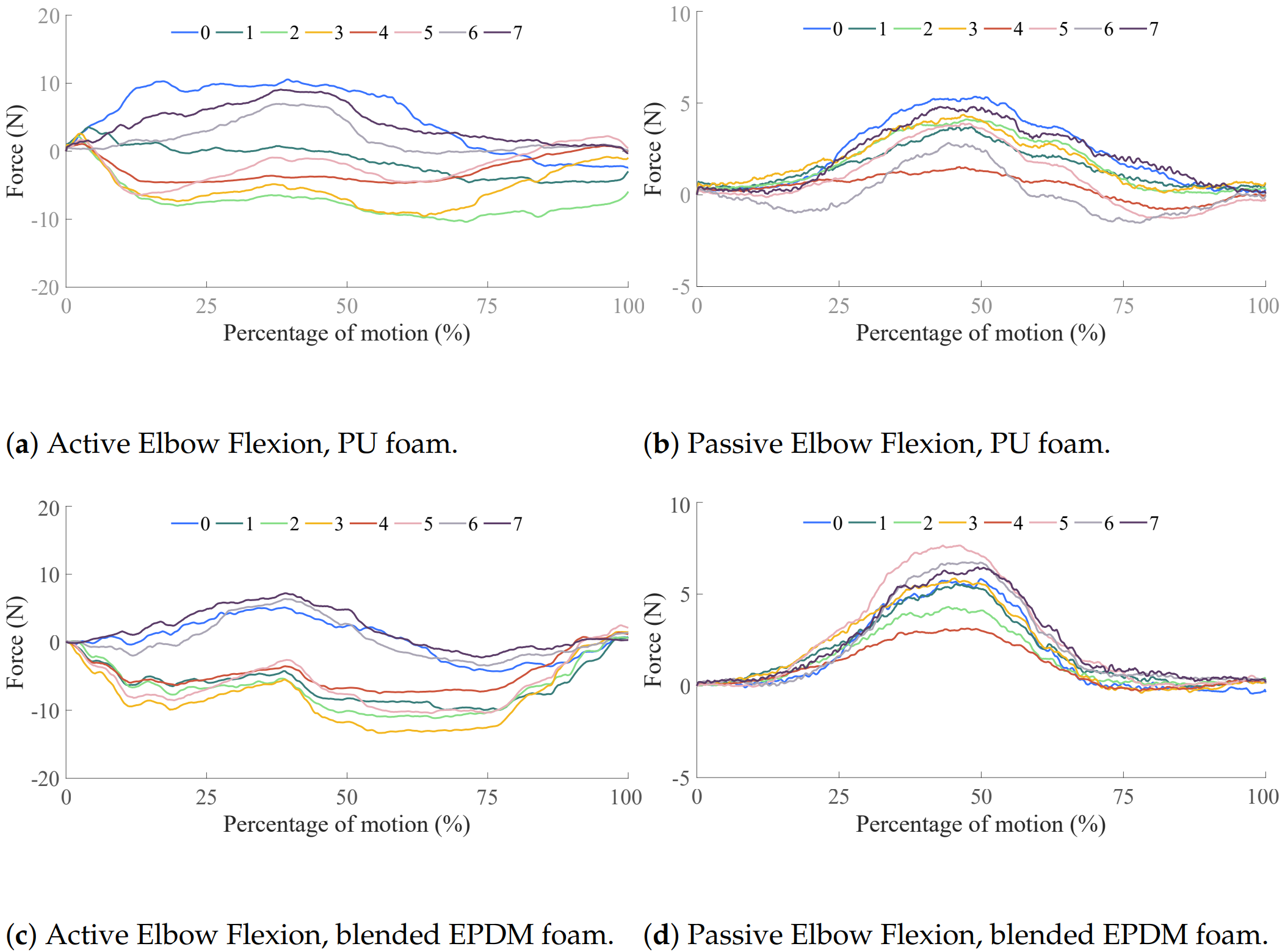 Results from the elbow flexion–extension movements performed by the subject while wearing the Harmony exoskeleton. Active movements refer to the subject performing the elbow flexion–extension while the robot follows in the gravity-compensation mode. Passive movements refer to the robot performing the movement while the subject follows passively.